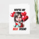 An adorable caucasian girl with long shiny brunette hair is wearing a pale blue and red tee and is holding a bunch of red heart-shaped balloons up. She is set agaisnt a white background and the words "you're my best friend" appear in a bold black and red lettering around her. This is ideal for best friends wanting to express how they feel about each other, for kids wanting to say a cute "Happy Valentine's day" to a classmate or for friends saying "Happy birthday" to each other. Personalise the inside which is blank with your custom message.