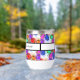 Best Grandma in the World typography in black against white background black outlined rectangle. Love NAME on backside. Pretty colourful artsy flower petals watercolors in pink, red, orange, green, blue, purple against white background. Original Artwork by TamiraZDesigns.