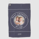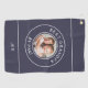 Creating your own golf towel is easy with our user-friendly template. All you need to do is upload your best photo and enter your initials, name, or any text you want. You can also customise the colours of the text and the background to match your grandpa's style. The photo and the text are printed in white with two circular white borders, creating a striking contrast with the classic navy blue background.
