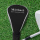 An elegant black golf head cover for a golfer grandfather featuring his name monogrammed in classic white serif typography and "Best Grandpa Ever" in simple modern white typography.