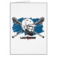 Bold lacrosse design with lacrosse helmet and crossed lacrosse sticks with blue background. Lower LACROSSE letting with red x cross. Great lacrosse gift for lacrosse players and fans!