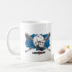 Bold lacrosse design with lacrosse helmet and crossed lacrosse sticks with blue background. Lower LACROSSE letting with red x cross. Great lacrosse gift for lacrosse players and fans!