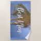 Best Man beach or destination wedding theme. Best Man is written in white script. Background has blue sky with pretty close-up of three palm trees with fronds blowing in the ocean breeze. Fun keepsake beach towels for the wedding party. Original Photography and Design © TamiraZDesigns.