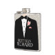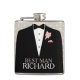 Smartly dressed best man in tuxedo and black bow tie graphic wedding hip flask. Reads Best man Richard. Personalise with your own name and title. A great personalised gift idea for male bonding on bucks nights / stag nights, wedding rehearsals or as a wedding favour.