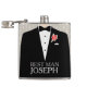 Smartly dressed best man in tuxedo and black bow tie graphic wedding hip flask. Reads Best man Joseph. Personalise with your own name and title. A great personalised gift idea for male bonding on bucks nights / stag nights, wedding rehearsals or as a wedding favour.