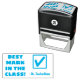 This motivating rubber stamp design features the motivational message "BEST MARK IN THE CLASS!" and a custom educator name. It also has a decorative check mark icon. It could be used by a teacher, educator, or tutor when marking assignments, to acknowledge that the student has done a great job.