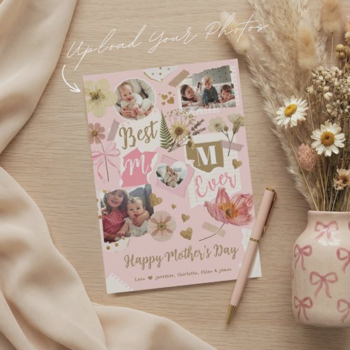 Celebrate Mom with a heartfelt Mother’s Day greeting card featuring a “Best Mom Ever” scrapbook-style photo collage design, thoughtfully created to look like a beautifully handcrafted memory page. Layered torn-paper textures, mixed typography, and soft vintage-inspired details come together to create a warm, nostalgic feel filled with love and meaning. This card is the perfect way to share your appreciation and heartfelt message, turning your favorite memories into something she can hold onto forever. The cozy scrapbook aesthetic blends timeless charm with a modern touch, making it a meaningful and unique keepsake she’ll cherish long after Mother’s Day has passed. Personalize with your favorite photos and a special message inside to create a one-of-a-kind card that truly comes from the heart. Thoughtful, sentimental, and beautifully designed, it’s a gift in itself.