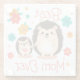 Adorable coaster for a mother's day treat featuring a cute illustration of a mummy hedgehog holding the hand of her baby hedgehog. The little hedgehog is holding a pink love heart. Both hedgehogs have dark brown spines and a tan body, each have rosy cheeks, shiny eyes and a little smile. Floating around above the cute animals are colourful flowers in blue, yellow and red. Fun pink font above and below the illustration reads 'Best Mum Ever'.