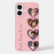 Design your own phone case with this pretty pink photo template iPhone 16 phone case with space to add 4 custom photos. Upload your favourite pictures and customise the name with your personalisation. A great gift for Mum when you add your own photos of the kids or pets! Features a soft pink cover with glitter heart backgrounds on the heart photo templates.