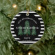 Show love for your neighbours with this Best Neighbours Ever Elegant Pine Trees Christmas Ceramic Ornament. It is trendy designed with black background on centre and black and white stripes on outer edges. A set of three green pine trees was created from personal art work hand drawing. The text "best neighbours ever" is in white font curved over the trees. Personalised with neighbour's first names on the centre. Customised with year and signature from name on the lower area.