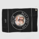 Creating your own golf towel is easy with our user-friendly template. All you need to do is upload your best photo and enter your initials, name, or any text you want. You can also customise the colours of the text and the background to match your grandfather's style. The photo and the text are printed in white with two circular white borders, creating a striking contrast with the classic black background.