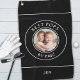Creating your own personalised golf towel is super easy with our online template. All you need to do is upload your favourite family photo and type in a monogram, name, or any text you want. You can also choose the colours of the text and the background to match your pop's style. The photo and the text are printed in white with two circular white borders, which contrast with the solid black background.