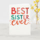 This greeting card features the message “BEST SISTER ever” on a white background, and it feels like a big, happy shout of love ❤️. “BEST” sits across the top in large letters, with a red “B” covered in white and yellow polka dots, pink “E” and “S” with tiny multicolor dots, and a red “T” filled with teal diagonal stripes and small yellow accents. Right below it, “SISTER” appears in teal letters sprinkled with bright little spots, and you can notice tiny extra markings tucked inside parts of the letters if you look closely. Near the bottom, the word “ever” is written in smooth orange cursive-style lettering that curves gently across the lower area. Small red dots and a few star shapes are scattered around the words, adding a cheerful finish without taking attention away from the message. The mix of colors and patterns makes the card feel lively, but the message stays clear and sweet. It’s a meaningful card to give when you want your sister to feel appreciated, seen, and truly loved 🥰.