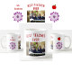 Cute, modern, and elegant teacher appreciation mug with the words "Best Teacher Ever" in all caps in a clean sans serif font + a customisable name and photo, two purple flowers, and an apple.