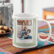 Modern contemporary 5 photo collage custom family template coffee mug in pastel sage green and white with a trendy typography style. +++++++++ Personalise it with 5 family shoots and your name and text! +++++++++++++++ It can be a beautiful savour the memory keepsake gift for New Year, Christmas, anniversary, new home, mum, dad, grandma or grandpa's birthday, or any other festive family occasion.