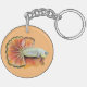 A watercolor of a vibrant Orange-Red male Betta Splendens fish adorns this keychain!
