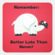 Elephant with ribbon tied around it's trunk, with message: "Remember: Better Late Than Never"