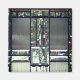 A modern, masculine design featuring birch trees seen through beveled glass on a metallic, silver pinstripe background. Elegant and masculine stained glass look. In colours of silver and black.