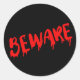 A sticker for Halloween saying "beware" in a bright red font on a black background designed to look like dripping blood. This would be perfect for any horror or vampire themed party to seal the envelopes on your invitation or to hand out to party-goers.