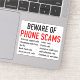 "Beware of phone scams" Detailed text to spread the word: to be cautious about phone calls as there may be scammers trying to steal information or money from you. The most common ones being Technical Support scams, IRS scams, bank fraud and debt scams.