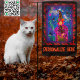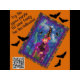 Charming red headed witch holds her black cat on a mysterious Halloween night, while three mischievous crows caw in the dead trees, while two ghosts and lots of bats fly in the sky A fun family project for Halloween or just for fun! Vibrant bright colours.