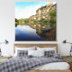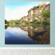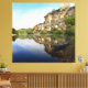 Canvas landscape print of the castle and the village of Beynac-et-Cazenac built upon the cliffs alongside Dordogne river in the early morning with reflection in the river and a kayak in the foreground. The town is situated in the Perigord in France.
