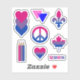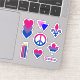 Custom-cut vinyl stickers with a variety of designs in the colours of the bisexuality pride flag; the included shapes: a peace sign, hearts, stars, a maple leaf, a fleur-de-lis, pencils, and the text pride
