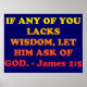 IF ANY OF YOU LACKS WISDOM, LET HIM ASK OF GOD. - James 1:5. From Clarke's Commentary: James 1:5. If any of you lack wisdom - Wisdom signifies in general knowledge of the best end, and the best means of attaining it; but in Scripture it signifies the same as true religion, the thorough practical knowledge of God, of one's self, and of a Savior. Let him ask of God - Because God is the only teacher of this wisdom. Order your copy of the poster with this beautiful image of the Bible scripture on it today!