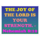 THE JOY OF THE LORD IS YOUR STRENGTH. - Nehemiah 8:10. From Clarke's Commentary: Nehemiah 8:10. For the joy of the Lord is your strength - This is no gluttonous and drunken festival that enervates the body, and enfeebles the mind: from your religious feast your bodies will acquire strength and your minds power and fervour, so that you shall be able to Do His will, and to do it cheerfully. Religious joy, properly tempered with continual dependence on the help of God, meekness of mind, and self-diffidence, is a powerful means of strengthening the soul. Order your copy of the photo print with this beautiful image of the Bible scripture on it today!