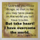 Bible verse from John 16:33 “I have told you these things, so that in me you may have peace. In this world you will have trouble. But take heart! I have overcome the world.”
