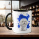 A beautiful water colour portrait of an adorable white Bichon Frise stands out against a bright blue abstract paint splatter background. The image is on two sides of the mug, with your name or other custom text in black between them.