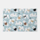 Cute bichon frise dogs in sweaters and bows with scattered dog bones and paw prints on a light blue background.