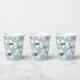 Cute bichon frise dogs in sweaters and bows with scattered dog bones and paw prints on a light Blue background.