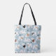Cute bichon frise dogs in sweaters and bows with scattered dog bones and paw prints on a light blue background.