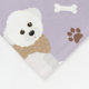 Cute bichon frise dogs in sweaters and bows with scattered dog bones and paw prints on a light purple background.