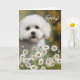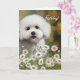 A sweet birthday card for the Bichon Frise mom or lover of the breed with a cute Bichon surrounded by white daisies and a lovely blurred bokeh background with golden hues.