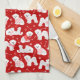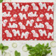 Cute Valentine's Day Bichon Frise dogs wearing red, pink, and white polka dot and heart sweaters with scattered paw prints and arrow on a red background.