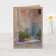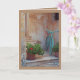 This scene of a turquoise bicycle and a potted red geranium on a front stoop.  Blank inside with area for your own message.