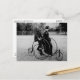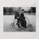 This is a black and white vintage photograph taken in 1886 of a couple sitting in front of the White House on their bicycle for two.