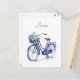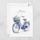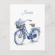 watercolor painting of a bicycle with a basket full of flowers in Delft Blue colours
