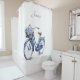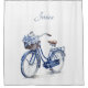 watercolor painting of a bicycle with a basket full of flowers in Delft Blue colours