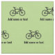 A cycling themed motif with a racing bicycle and your choice of a name or short personalised text for any occasion. It's easy to change the background colour from the leaf green shown here via the edit option which will give you access to a palette.