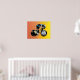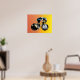 A fast cyclist in a comic book style races across this bright coloured card to win this race.