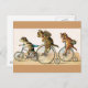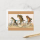 Adorable vintage illustration of two cats and a puppy riding their bikes with backpacks on.