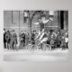 Old photo of Herbert Bell & Joe Garso, one-legged trick cyclists, performing bicycle tricks for a crowd. Photograph taken in 1921.