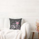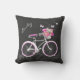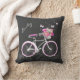 Stylish accent throw pillow done in a chalkboard grey colour, with graphics of a girl's white and pink bicycle, with it's basket holding colourful flowers, with butterflies and swirly accents. The back of the pillow has a grey, white, and pink striped pattern. Personalise the white text, on the front, for yourself or as a great gift idea.