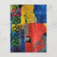 A mixed media collage by the artist Angelandspot and photographed by Angelandspot with vintage children's book pages showing trucks and bicycles that I randomly used in a bright colored collage and then used pastels, highlighters, and paints on to make random marks.