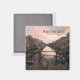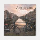Souvenir photo magnet with some bicycles locked to the bar of a bridge over Prinsengracht canal lined by traditional canal houses at sunset in the city centre of Amsterdam in the Netherlands with the text 'Amsterdam, The Netherlands'.
