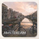 Souvenir coaster with some bicycles locked to the bar of a bridge over Prinsengracht canal lined by traditional canal houses at sunset in the city centre of Amsterdam in the Netherlands and the text Amsterdam.