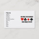 No need to be a professional bridge player to enjoy wry bridge humour with this business card featuring the four card suits as well as the truism saying often discussed amongst bridge partners in bridge tournaments: "Bid What You Can Make Make What You Bid". Make others do a double-take with a dose of sound bridge advice today!